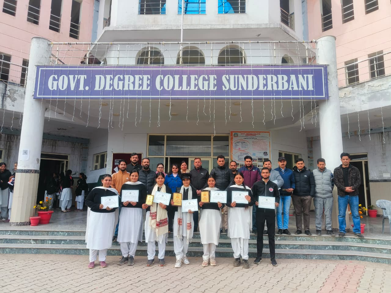 Government Degree College Sunderbani today organised a seminar on the Constitution of India under the aegis of Cultural Committee of the College to commemorate the 150th anniversary of Vande Mataram. The seminar was aimed at sensitizing students to the constitutional values, democratic ideals, and national ethos that form the foundation of the Indian Republic. The programme witnessed enthusiastic participation from students and faculty members. Dr. Shakoor Ahmed, faculty member of Political Science acted as the Resource Person who delivered an enlightening presentation supported by a comprehensive PowerPoint elaborating on the philosophy, fundamental rights, preamble, other salient features, and contemporary relevance of the Constitution of India. His scholarly exposition was highly appreciated by the audience. As part of the seminar proceedings, students were assessed for their academic engagement. Ms. Sohani Rajput of 4th Semester secured the First Position, Ms. Survi Sharma of 6th Semester bagged the Second Position, while Ms. Anshu Sharma of 4th Semester secured Third position. The achievers were felicitated with mementos along with certificates, while all participating students were awarded certificates in recognition of their active involvement. The programme concluded with a formal Vote of Thanks by Dr. Rakesh Kumar, Convener of the Seminar, who expressed sincere gratitude to the resource person, college administration, faculty members, students, and the organizing committee for their valuable cooperation. The seminar concluded on a patriotic note, reaffirming faith in the Constitution of India and the enduring spirit of Vande Mataram.